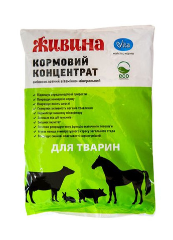 Високо ефективна натуральна кормова біодобавка ЖИВИНА ™ – амінокислотний вітамінно-мінеральний кормовий концентрат, що дозволяє швидко вирощувати тварин. В основу продуктивної дії кормового концентрату ЖИВИНА лежить його всебічний позитивний вплив на біохімічний склад кормосумішей, співвідношення білкових складових корму, вітамінну, макро-мікроелементну наповненість, стимулювання ферментної активності органів травлення, захист від дії негативної мікрофлори та покращення смакових характеристик кормів в цілому. Опис складових продукту: 1. Незамінні амінокислоти (лізин, метіонін, треонін) (Lis-Met-Tre) 100:50:40 ; включені до складу ЖИВИНА ™, є головними факторами формування продуктивного потенціалу тварин на монозернових кормосумішах. Оптимальне співвідношення та дозоване введення, згідно з рекомендаціями щодо використання, дозволяє довести поживність кормосумішей до максимально ефективного рівня (2,5-3 кормових одиниць / 1 кг. приросту) 2. Макро (Ca , P) - мікроелементи (Fe,Zn, Cu, Mn, I) . Балансування співвідношення макро-мікроелементів дозволяє поповнити їх дефіцит та оптимізувати склад у кормосумішах, забезпечити правильність процесів росту, розвитку, розмноження, кровообігу, травлення. 3. Вітаміни (А, В, D, E) . Введення вітамінів до складу кормового концентрату прискорює зростання та розвитку тварин та птиці, підвищує загальний тонус тварин, активізує діяльність низки фізіологічних систем. 4. Капсаїцин Capsicum spp (Capsaisin 4%) . Речовина природного походження; стимулює активність органів травлення, сприяє засвоєнню поживних речовин, знімає тепловий стрес. 5. Циннамальдегід Cinammonum spp (Cinnamaldegide 1,4%) . Речовина природного походження; захищає мікроворсинки шлунка від дії токсинів та вільних радикалів. Використання : Застосовується як комбікорм-концентрат для балансування раціонів продуктивних та непродуктивних тварин, птиці за амінокислотами, мікроелементами; стимулює ферментну активність, нормалізує кишкову мікрофлору, підвищує резистентність організму, покращує продуктивність. Дозування : Добова норма дачі поєднується з основним кормом у сухому або вологому вигляді і згодовується тваринам у кілька прийомів, як це прийнято в господарстві, не піддаючи термічній обробці. Незначне передозування не є небезпечним для організму тварин. Добова норма введення кормового концентрату інших видів тварин розраховується залежно від маси тіла тварини з розрахунку: 1-1,5 гр./1 кг. живої ваги. Протипоказання : не виявлено Попередження : Передозування може спричинити пригнічення тварин та зниження поїдання кормів. Після використання кормового концентрату ЖИВИНА™ м'ясо, продукція тваринництва та птахівництва використовують без обмеження. Форма випуску : Гранули або крупка. Багатошарові паперові мішки по 1, 1,5 та 25 кг. Зберігання : Зберігати у сухому темному приміщенні за нормальних умов. Гарантований термін зберігання : 9 місяців від дати виробництва.