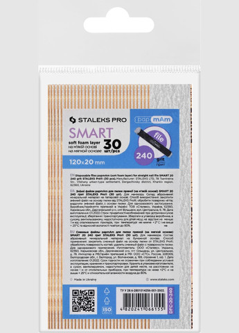 До особливо зручних прямих пилочок зі знімними абразивами — файли Staleks Pro Smart 20 Soft Foam Layer. Набір одноразових шліфувальних насадок призначений для використання на спеціальній дерев'яній основі. Її можна стерилізувати та дезінфікувати різними способами, регулярно змінюючи витратні абразивні матеріали. Особливості Staleks Pro Smart 20 Soft Foam Layer: - кілька варіантів абразивності на вибір: 100, 150, 240 грит;- у кількості 30 штук розміром 120x20 мм;- просте зняття, прикріплення та надійна фіксація;- дрібне абразивне напилення з оксиду алюмінію;- стеаратне покриття, що запобігає забиванню абразиву;- прошарок піни, що знижує тиск на нігтьову пластину;- універсальний в роботі — підходить і для манікюру, і для педикюру;- делікатно обробляє нігтьову пластину без пошкодження;- гарантує безпеку, зручність і стерильність;- зводить до мінімуму ризик поширення грибка та інфекцій.
