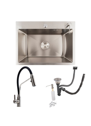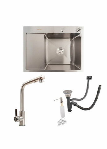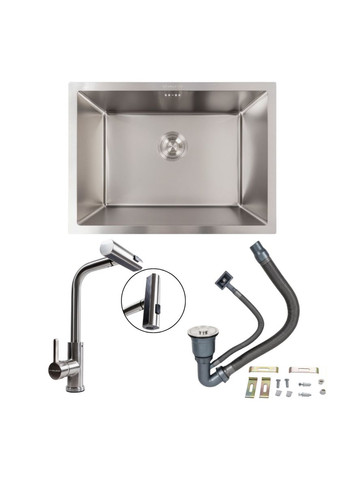 Кухонний комплект: Мийка Valeso Handmade (58x43 см) + Змішувач KN36 Цей кухонний комплект Valeso — це стильне та функціональне рішення для вашої кухні, що поєднує простору мийку, розроблену для монтажу під стільницю, та зручний гнучкий змішувач. Він ідеально підійде для тих, хто цінує мінімалістичний дизайн, ефективне використання простору та високу надійність. На весь комплект поширюється гарантія 1 рік. Що входить до комплекту? До цього комплекту включено: Кухонна мийка Valeso Handmade (58x43 см) Змішувач Valeso KN36 Сифон (круглий) Повний набір кріплень для мийки та змішувача Кухонна мийка Valeso Handmade (58x43 см) Ця мийка є втіленням елегантності та функціональності, призначена для кухонь невеликих та середніх розмірів. Лаконічний дизайн її прямокутної форми добре пасує різним інтер’єрам кухні. Матеріал: Виготовлена з високоякісної нержавіючої сталі SUS 201, що гарантує її довговічність, стійкість до корозії та збереження елегантного зовнішнього вигляду на довгі роки. Товщина сталі: 3.0 мм (основний корпус) та 0.8 мм (стінки) забезпечує міцність та надійність конструкції. Розміри мийки: 580x430x225 мм. Розмір чаші: 500x300x225 мм, що надає достатньо місця для комфортного миття посуду. Сифон: Діаметр сифона 110 мм. Покриття: Захищає її від подряпин, потемніння та нальоту. Така кухонна мийка не боїться високих температур та впливу засобів побутової хімії. Переваги мийки VALESO Handmade 58*43: Оригінальний дизайн. Можливість встановити під стільницю та над стільницею. Легко доглядати та мити. Вимоги до монтажу: Для монтажу мийки потрібна ширина стільниці не менше 600 мм. Змішувач Valeso KN36 (Гнучкий) Гнучкий змішувач VALESO KN36 — ідеальний вибір для тих, хто цінує зручність та стиль. Його ергономічний дизайн та гнучкість забезпечують максимальний комфорт під час щоденного використання на кухні. Матеріал: Виготовлений з високоякісної нержавіючої сталі SUS304 та має стильне каучукове покриття чорного кольору, що поєднує надійність, довговічність та сучасний вигляд. Розміри: Висота змішувача становить 440 мм, довжина виливу — 210 мм, а висота від основи до носика — 200 мм. Ці параметри забезпечують оптимальний радіус дії та зручність наповнення високих ємностей. Гнучкий дизайн: Можливість налаштовувати положення виливу за власними потребами, забезпечуючи максимальний комфорт під час миття посуду та продуктів. Чому варто обрати цей комплект? Сучасний дизайн: Поєднання мінімалістичної мийки для підстільного монтажу та стильного гнучкого чорного змішувача створює елегантний та сучасний вигляд вашої кухні. Ефективне використання простору: Монтаж мийки під стільницю звільняє робочу поверхню, роблячи прибирання легшим та підвищуючи функціональність. Надійність та довговічність: Високоякісні матеріали (нержавіюча сталь SUS 201 та SUS304) гарантують тривалий термін служби обох елементів комплекту. Зручність у використанні: Глибока чаша мийки та гнучкий змішувач забезпечують максимальний комфорт у щоденних кухонних справах. Гарантія якості: 1 рік гарантії на комплект надає впевненості у вашому виборі.