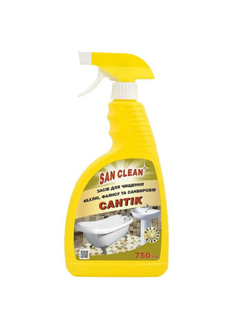 Засіб для чищення San Clean (Сан Клін) Сантік для сантехніки - ефективний очищувач, що підходить для щоденного догляду за всіма поверхнями у ванній кімнаті та на кухні. Основні переваги: підходить для унітазів, раковин, ванн, плитки, змішувачів, чайників, металевого посуду та ін. видаляє іржу, вапняний наліт, мильні відкладення та інші забруднення без абразивів - не дряпає і не пошкоджує поверхню запобігає неприємним запахам залишає приємний, свіжий аромат Характеристики Об'єм: 750 мл Виробник: San Clean, Україна.