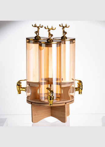 Вишукана скляна лимонадниця 3в1 об'ємом 5.5 літра — ідеальний вибір для стильної подачі напоїв на фуршетах, банкетах, вечірках та домашніх зустрічах. Три окремі ємності дозволяють подавати відразу кілька видів напоїв, фруктової води чи домашнього лимонаду. Декоративні кришки із золотими оленями та краники під золото надають сервіруванню преміального та святкового вигляду. Міцна дерев'яна підставка робить конструкцію стійкою та естетичною. Характеристики лимонадниці 3в1 загальний об'єм: 5.5 літра; кількість ємностей: 3 шт.; об'єм однієї колби: ~1.83 л; діаметр кожної ємності: 9.5 см; загальний діаметр лимонадниці: 21 см; висота кришками: 40 см; матеріал колб: термостійке скло; матеріал кришок та кранів: метал із золотистим покриттям; підставка: натуральне дерево, поворотна конструкція. Лимонадниця відмінно підійде для соків, компотів, води з цитрусами, ягідних напоїв та авторських настоянок. Кожна ємність має власний кран, що забезпечує зручність використання. Поворотна дерев'яна основа полегшує доступ до будь-якої з ємностей та робить подачу максимально комфортною. Переваги лимонадниці на 3 секції 3 окремі колби — подання різних напоїв в одному оформленні. Преміальний зовнішній вигляд — ефектні золоті кришки з оленями та фурнітура. Термостійке скло — зберігає смак напоїв, легко миється. Компактна кругла форма — займає мінімум місця на столі. Ідеальна для заходів, кейтерингу, кафе та подарунків. Купити скляну лимонадницю 3в1 із золотими деталями та дерев'яною підставкою можна з доставкою по всій Україні. Безпечна упаковка гарантує безпеку під час транспортування. Перетворіть кожну подачу напоїв на подію.