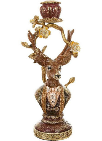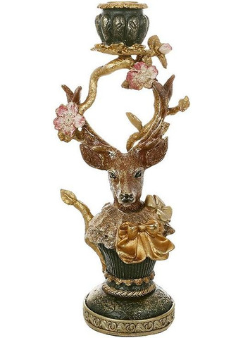 Декоративний свічник "Олень у зеленому" із розкішної колекції предметів декору "Старий Замок". Виготовлений з полістоуну - штучний камінь із кольоровою емаллю та золотою поталлю. Розмір свічника: 13.5х10.5см, висота - 31см. Для 1 свічки діаметром до 23мм. Запаковано в щільну картонну коробку з пінопластовим ущільнювачем.
