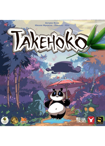 «Такеноко» - логічна сімейна гра від знаменитого Антуана Боза, автора таких суперхітів як «7 чудес», «7 чудес: Дуель», «Ханабі», «Драфтозаври», «Ghost Stories» і «Last Bastion». Настільна гра «Takenoko» була розроблена у 2011 році. У 2011-16 роках вона ставала номінантом конкурсів «Boardgames Australia Awards», «Hra roku», «JoTa», «Nederlandse Spellenprijs», «Spiel der Spiele», «Tric Trac», «Gra Roku», «Guldbrikken», «Vuoden Peli» і переможцем конкурсів «Golden Geek», «As dOr», «Le Lys», «Games Magazine», «Ludoteca Ideale» і «Årets Spill». Гра досі входить до ТОП-50 найкращих сімейних ігор на сайті «BoardGameGeek». Такеноко. Логічна гра про садівника і панду Учасники гри «Такеноко» перенесуться до мальовничої Японії, щоб зайнятися садівництвом в імператорському палаці. За легендою, японському імператорові одного разу подарували китайського ведмедя панду. Панду поселили в саду, за яким доглядав працьовитий садівник. І все б нічого, якби панда настільки не обожнювала бамбук. Тепер у садівника зявилася проблема. Виконання завдань в імператорському саду Упродовж гри учасники розширюватимуть сад новими ділянками, зрошуватимуть їх, вирощуватимуть різнокольоровий бамбук трьох видів і годуватимуть вічно голодну панду. Вони переміщують спільні фігури садівника й панди і виконують таємні завдання на картах. Завдання поділяються на три типи: Панда. Зїсти пандою зазначені на карті сегменти бамбука; Ділянки. Розташувати ділянки згідно з конфігурацією на карті; Садівник. Виростити бамбукові пагони заданої висоти і в зазначеній кількості. Кожне виконане завдання принесе переможні очки наприкінці гри. У підсумку переможе гравець з найбільшою кількістью очок. Перебіг гри На початку свого ходу гравець кидає кубик погоди. Залежно від випалого результату гравець отримує бонуси: «Сонце»: дотаткова дія; «Дощ»: розмістити сегмент бамбука на полі; «Вітер»: можливість виконати дві однакові дії; «Хмари»: отримання жетона поліпшення; «Буря»: переміщення панди й отримання сегмента бамбука. «?»: Можна вибрати будь-який бік кубика погоди. Далі гравець виконує дві різні дії з 5 можливих: викласти нову ділянку; отримати зрошувальний канал; перемістити садівника по прямій і виростити сегменти бамбука на ділянці, де він зупинився, а також на суміжних ділянках того ж кольору (бамбук росте тільки на зрошуваних ділянках); перемістити панду по прямій і зїсти сегмент бамбука на ділянці, де зупинилася фігурка; взяти карту завдання одного з трьох типів. Виконання завдання не вважається дією. У грі передбачені три типи жетонів поліпшення: садівник може захистити свій бамбук від панди, зросити ділянку або використати добриво, щоб бамбук ріс удвічі швидше. Такеноко як витвір мистецтва «Такеноко» - чудова логічна гра, яка сподобається всім: і дорослим, і дітям, і новачкам, і досвідченим гравцям. Гра може похвалитися простими правилами та невисоким порогом входження. Водночас вона має вельми глибокий геймплей і вимагає від гравців прораховувати свої дії на кілька ходів наперед. Азарту додають кубик погоди й таємні карти завдань. Гра «Такеноко» сама собою є витвором мистецтва - зворушливі розфарбовані мініатюри панди і садівника, красиві плитки із зображеннями ділянок саду і реалістичні різнокольорові сегменти, з яких складаються пагони бамбука. Такими компонентами просто приємно грати.