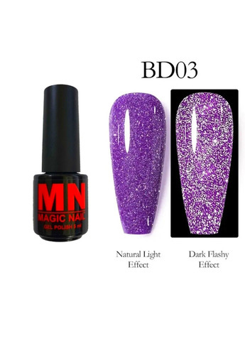 Гель-лак світловідбивний MagicNail Reflective Disco Flash Gel, 5 мл При звичайному денному освітленні гель-лак сітловідбивальний Magic Nail Reflective Flash Gel переливається шиммерним блиском з дрібними частинками, але при попаданні на нього штучного освітлення блиск змінює відтінок і мерехтять вже більші частинки, що створює неймовірний чарівний ефект. Світловідбивний гель-лак Reflective Disco MagicNail - сяють від прямого потрапляння променів світла. Щільні та покриваючі блискітки світяться у темному приміщенні або при приглушеному світлі та одночасно прямим потраплянням променя штучного світла, наприклад спалаху камери телефону. Гель лаки світловідбивні Reflective Disco Magic Nail стали популярними завдяки обємному ефекту блискучих катафот! Світловідбивні частинки пігменту лягають поступово, не смужать. З першого шару перекривають нігтьову пластину. Формула 9Free* забезпечує манікюру безпеку, не завдає шкоди нігтьовій пластині завдяки відсутності у складі токсичних елементів. *до складу гель-лаків не входять Acrylates Copolymer, Isopropyl Alcohol, Butyl Acetate, Dimethicone, Microcrystalline Wax, Mica, Color pigments. Професійне використання: