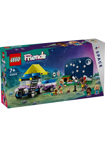 Конструктор LEGO Friends Кемпінговий автомобіль для спостереження за зірками Лего 42603 Діти, які обожнюють пригодницькі іграшки, знайдуть для себе багато цікавого завдяки цьому ігровому набору LEGO Friends Кемпінговий автомобіль для спостереження за зірками (42603) для дівчаток, хлопчиків і дітей віком від 7 років. До набору входить іграшковий телескоп, який можна скласти, повнопривідний автомобіль з кемпінговим причепом і самоскладний намет, дві мініляльки, фігурка собаки й фігурка їжачка. Надихайте дітей створювати сузірʼя, використовуючи планети й зірки для оздоблення фону. До набору також входять аксесуари, які допоможуть дітям розповісти історії про дружбу: горнятка, печиво, печиво для собак, бінокль, телескоп, ліхтарик, електронний планшет, додаткові зірки й наліпки різних планет для персоналізації. Цей дитячий конструктор стане чудовим подарунком до дня народження або з особливої нагоди для дітей, які обожнюють науково-дослідницькі іграшки. Діти можуть насолоджуватися легким і зрозумілим конструюванням завдяки додатку LEGO Builder. У ньому діти можуть масштабувати й обертати моделі у 3D, зберігати набори й відстежувати власний прогрес. Характеристики: Тип: блоковий Жанр: наземний транспорт Серія: Friends Вік: 7+ Стать: для хлопчиків і для дівчаток Кількість деталей: 364 Додатково: фігурки в комплекті Матеріал: пластик Габарити упаковки: 35.4 х 19.1 х 7 см